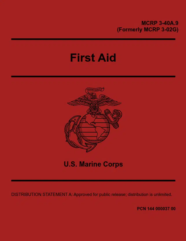 The United States Marine Corps MCRP 3-40A.9 First Aid Training Manual is 230 pages and was last updated in April of 2018. This training manual covers such topics as BASIC MEASURES FOR FIRST AID, FIRST AID FOR SPECIFIC INJURIES, FIRST AID FOR CLIMATIC INJURIES, and more.