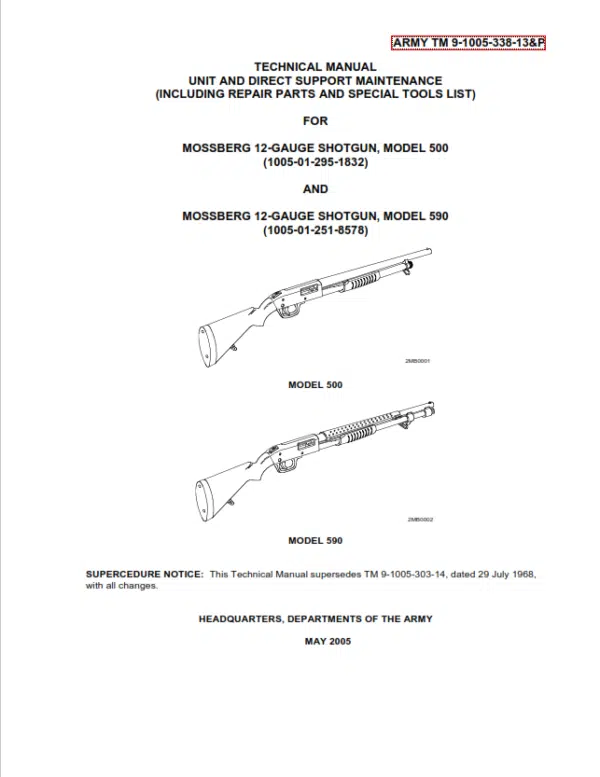 This TM 9-1005-338-13&P training manual, by the US Army, is for the Mossberg 500 and 590 pump action shotguns. This manual is 165 pages and was last updated in May 2005. The TM 9-1005-338-13&P Manual supersedes TM 9-1005-303-14, dated 29 July 1968,